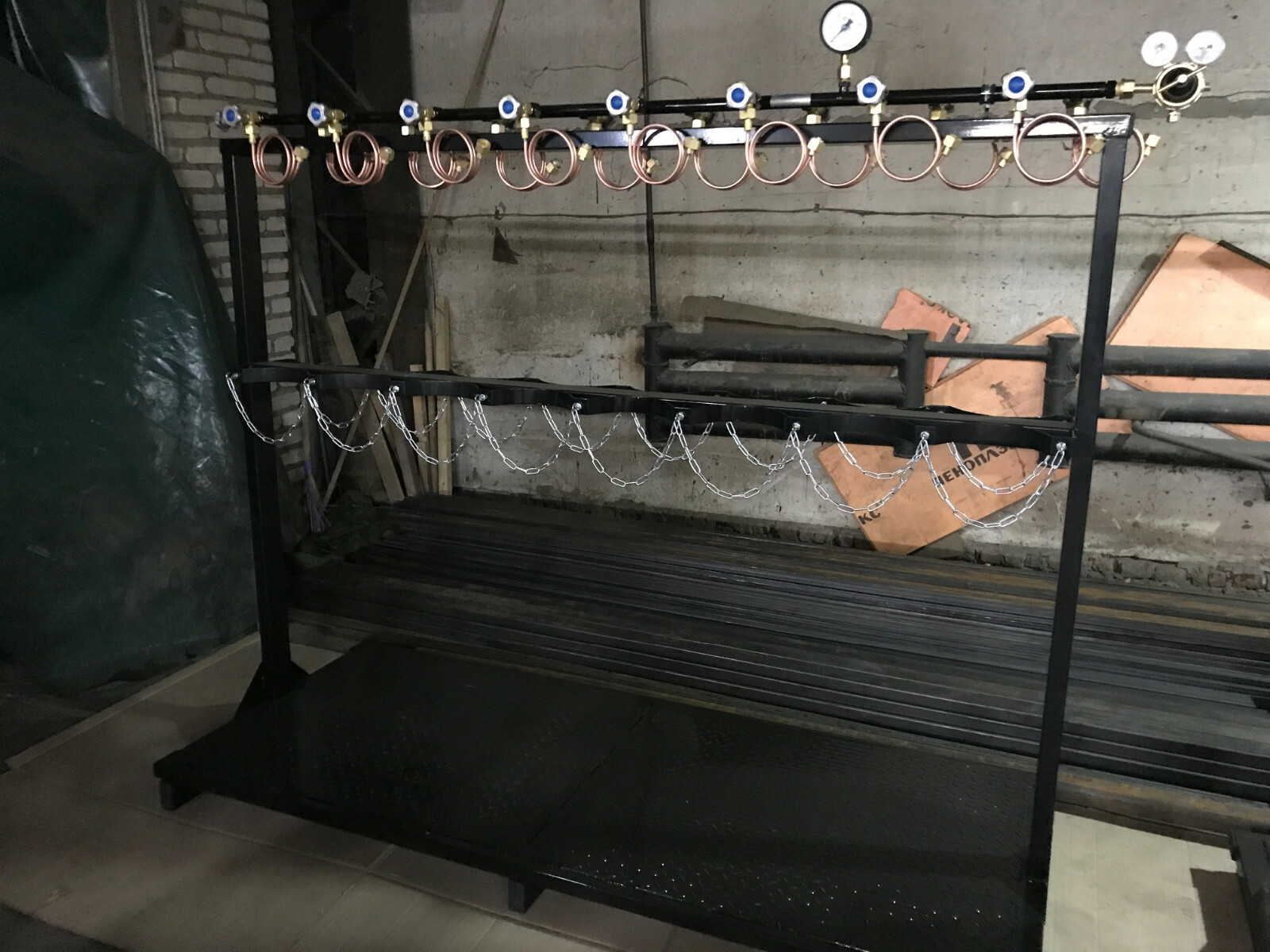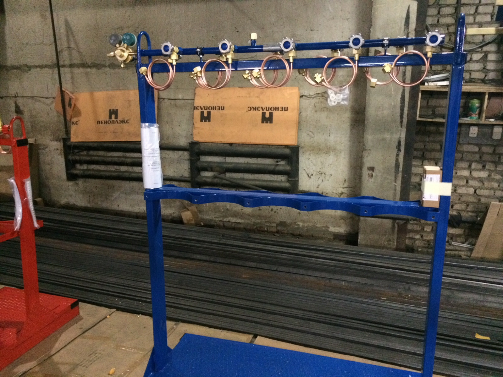 Принцип работы: Газ, после открытия вентилей на баллонах, поступает в баллонный редуктор. Затем после редуцирования через вентили подается в коллектор. Вентили на коллекторе позволяют отключать или заменять отдельные баллоны во время работы рампы.