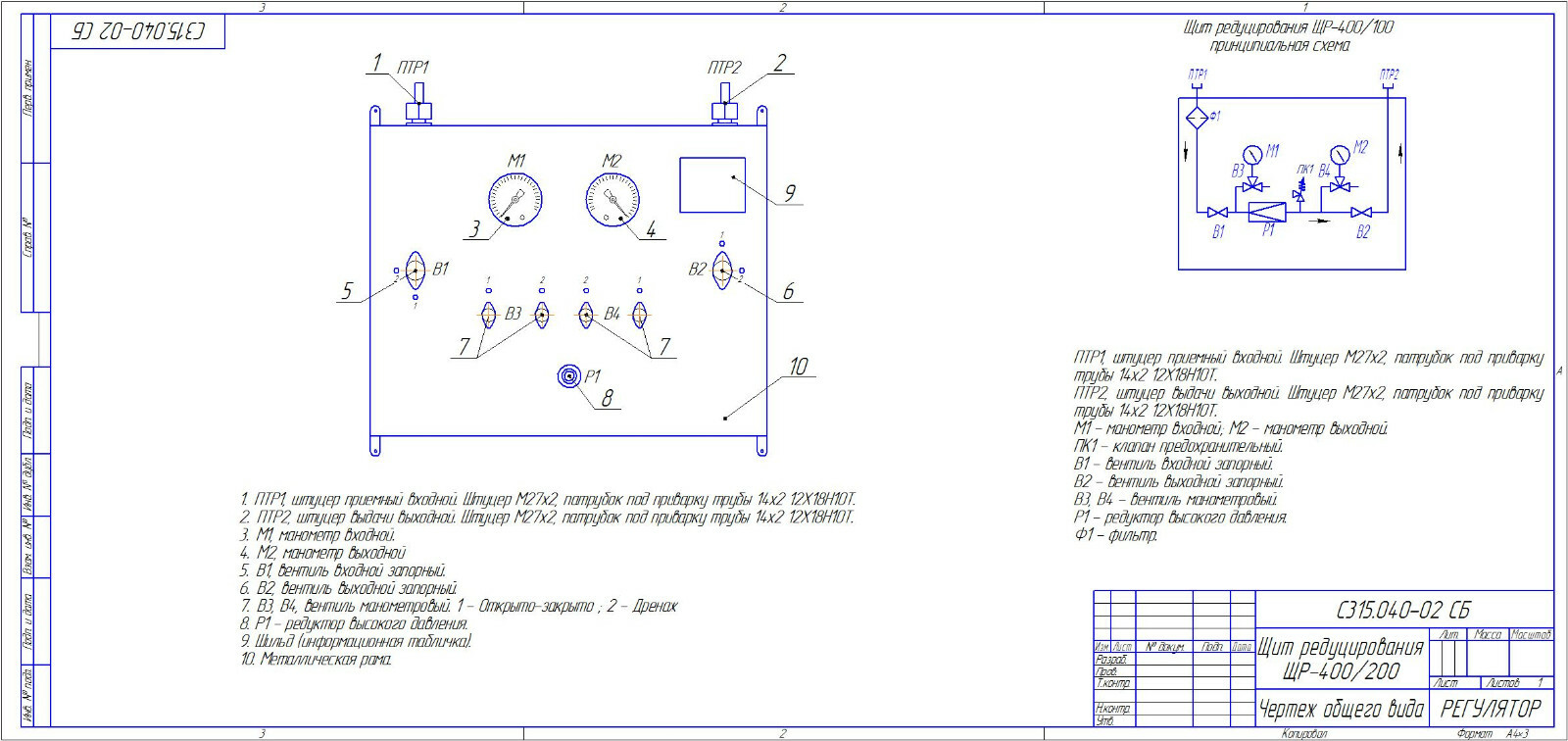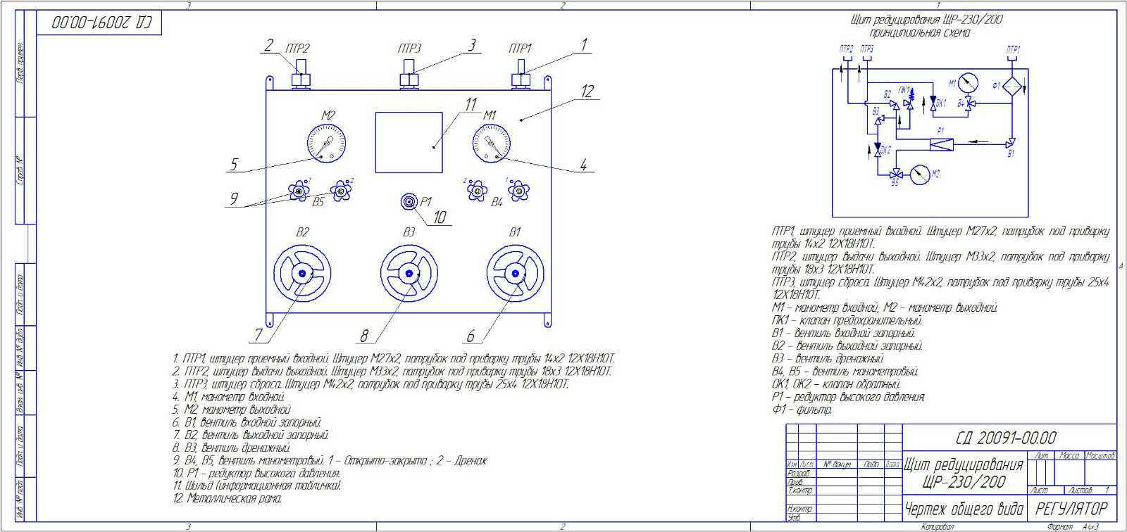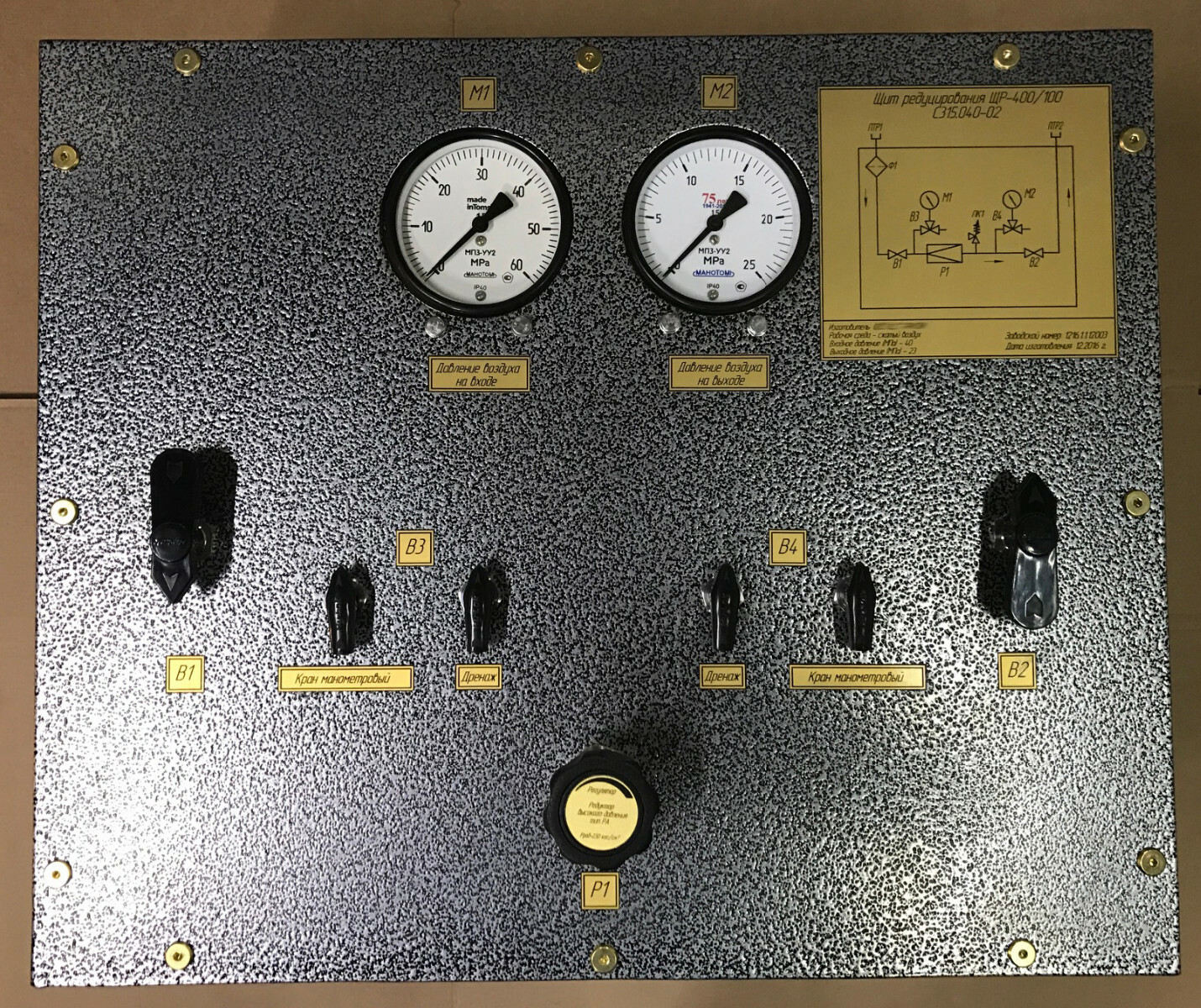 Щит редуцирования состоит из металлического каркаса (рамы), к которому крепятся штуцер приемный ПТР-1, штуцер выдачи ПТР-2. К передней панели крепится редуктор высокого давления. Конструкция щита редуцирования предусматривает наличие фильтра Ф1 на входе в щит, предохранительного клапана ПК1, установленного на рабочей магистрали щита (после редуктора). На передней панели щита установлены манометры для измерения давления воздуха на входе в щит и на выходе из щита, а также манометровые вентили для включения/отключения манометров и сброса газа на дренаж. Щит редуцирования крепится к стене крепежными элементами с помощью 4-х петель на каркасе щита.